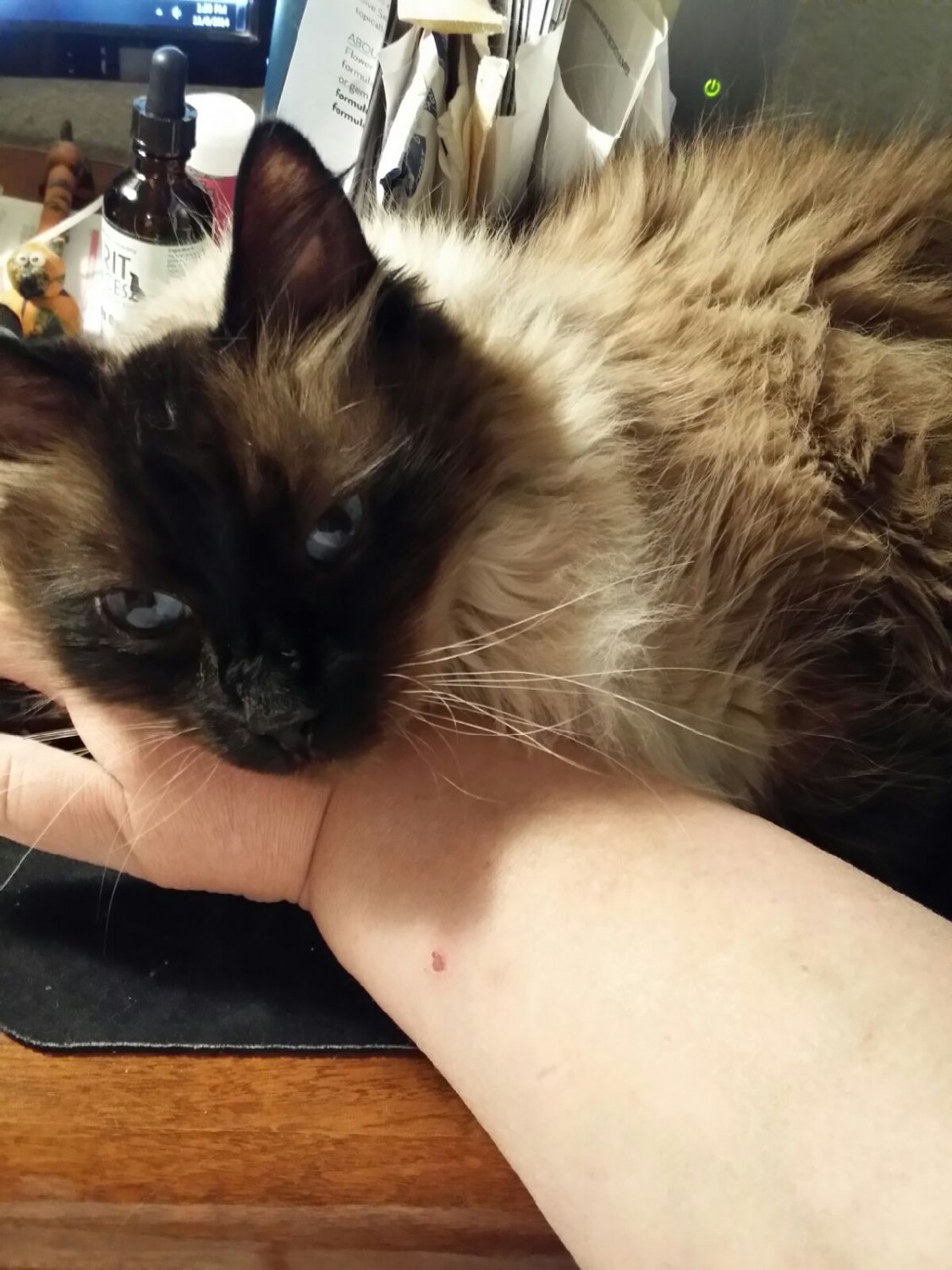 He was taken MUCH too soon by an aggressive cancer, with no warning signs. By the time we knew, we let him live out the rest of his days in peace and comfort, being loved, spoiled even more than usual, and stress-free. He passed peacefully, and easily, with help from Dr. Robinett, surrounded by a few close friends, and his loving mom, purring, and being told how much he was adored, loved, and how very beautiful he was. He will be missed forever and always.